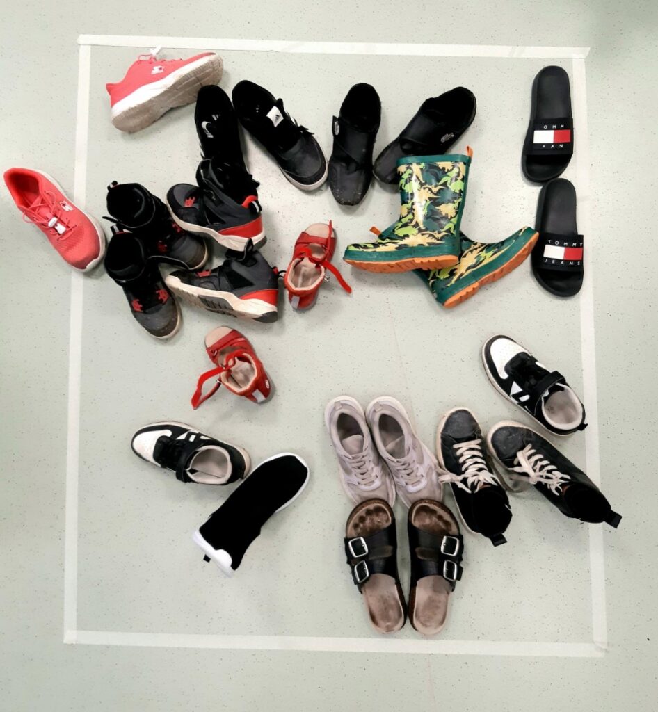 Luokissa tehtiin myös installaatioita valmiiksi olemassa olevista esineistä, kuten oppilaiden sukista, ulkovaatteista, repuista ja puuvärikynistä. Ideana oli, että teokseen ei käytetä mitään materiaalia, joka heitettäisiin pois teoksen purkamisen jälkeen.