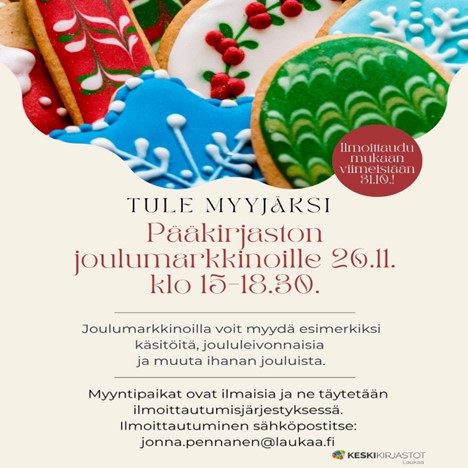 ❄️Joulumarkkinat järjestetään osana kirjaston joulutapahtumaa ke 26.11. klo 15 alkaen, mutta voit tulla paikalle oman aikataulun mukaan. Myyntipöydän ei tarvitse olla pystyssä heti klo 15.