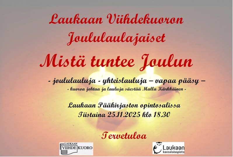 Joululaulajaisissa pääset kuulemaan ja laulamaan joululauluja Laukaan pääkirjaston opintosalissa ti 25.11. klo 18.30. Kuoroa johtaa ja lauluja säestää Malla Kärkkäinen. Vapaa pääsy, Tervetuloa!