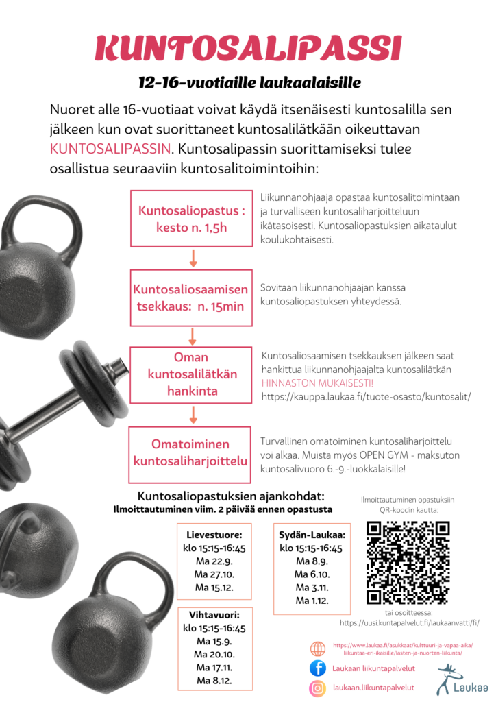 Kuntosalipassin suorittaminen on maksutonta. Kuntosalipassin lisätiedot 040 540 6548 TAI pipsa.pakkala@laukaa.fi/ liikunnanohjaaja. Kuntosalipasseihin ilmoittautuminen viimeistään 2 päivää ennen kurssia. Ilmoittautuminen osoitteessa: https://uusi.kuntapalvelut.fi/laukaanvatti/fi/