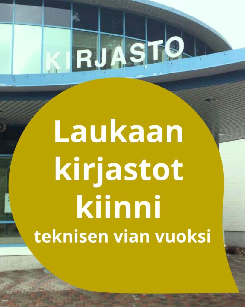 Tekninen vika Laukaan kirjastojen yhteyksissä jatkuu. Vika on kuulemma paikannettu, mutta sen korjaus on vielä kesken. Vian takia lainaaminen, palauttaminen ja omatoimikirjautuminen eivät onnistu.