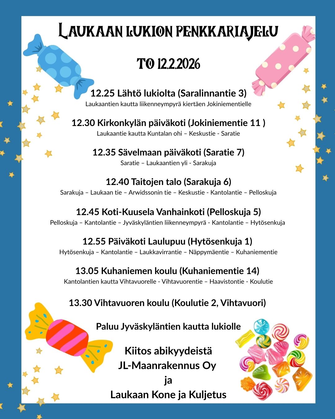 Laukaan lukio (klo 12.25) – Laukaantie – Kirkonkylän päiväkoti – Sävelmaan päiväkoti – Taitojen talo – Koti-Kuusela – Päiväkoti Laulupuu – Kuhaniemen koulu – Vihtavuoren koulu (noin klo 13.30). Ohesta näet tarkemmat aikataulut osoitteineen.