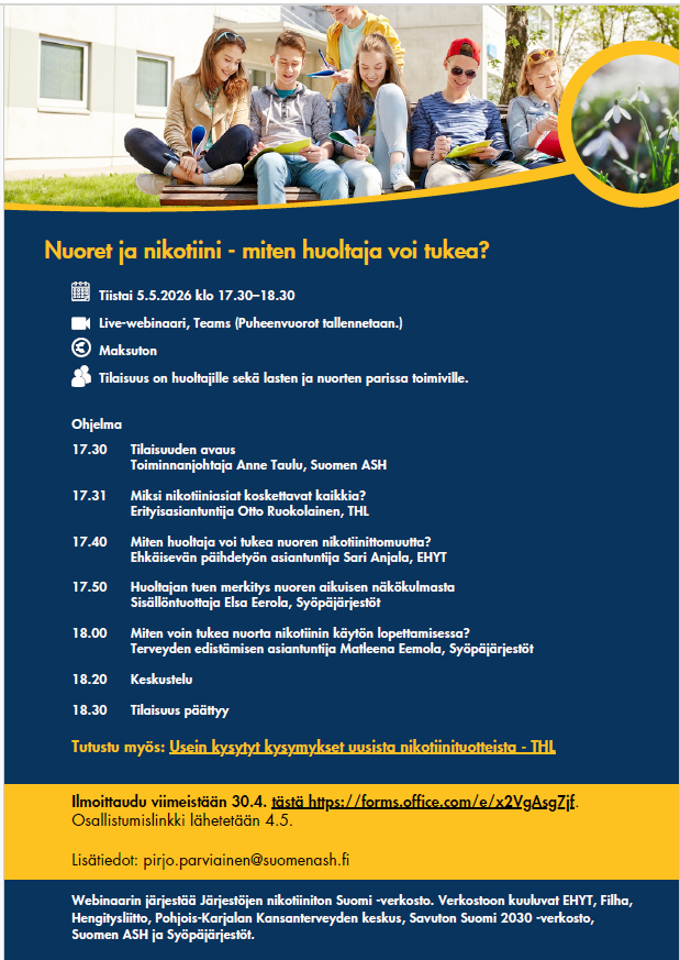 Järjestöjen nikotiiniton Suomi -verkosto järjestää tiistaina 5.5.2026 klo 17.30 – 18.30 Teamsissa maksuttoman webinaarin Nuoret ja nikotiini – miten huoltaja voi tukea?