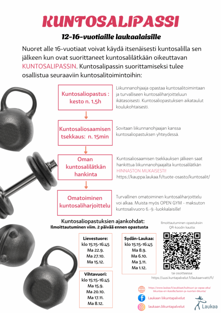 Kuntosalipassin suorittaminen on maksutonta. Kuntosalipassin lisätiedot 040 540 6548 TAI pipsa.pakkala@laukaa.fi/ liikunnanohjaaja. Kuntosalipasseihin ilmoittautuminen viimeistään 2 päivää ennen kurssia. Ilmoittautuminen osoitteessa: uusi.kuntapalvelut.fi/laukaanvatti