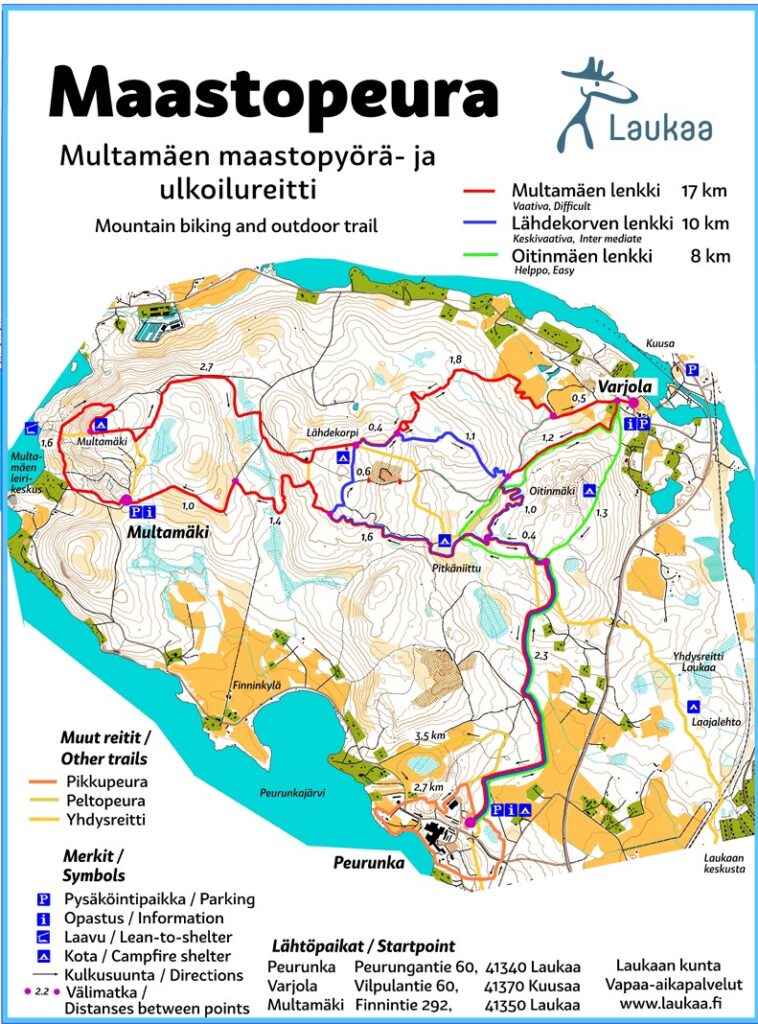 Reitin opastaulut ja kartat löytyvät Peurugasta, Varjolasta ja Multamäestä.